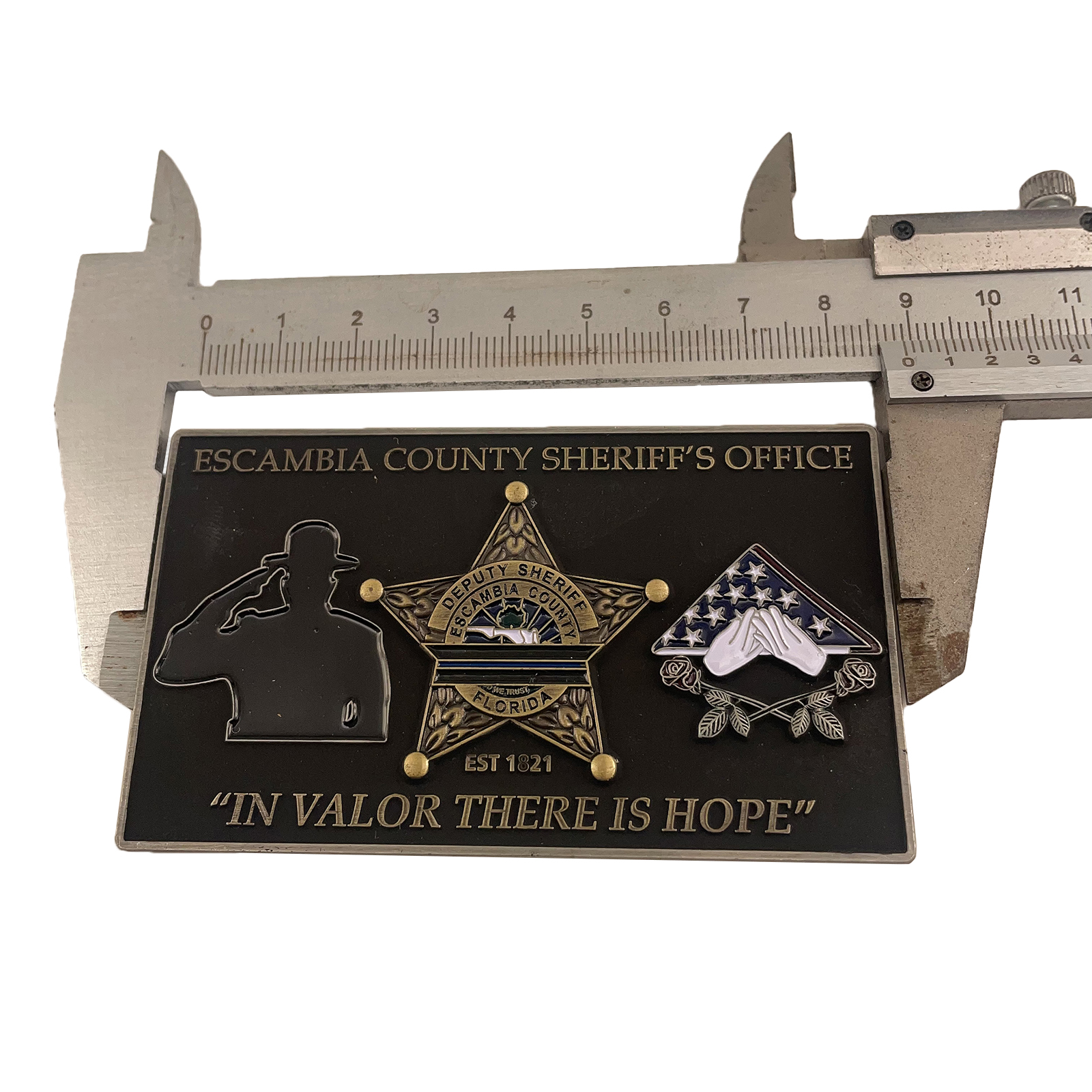 Distributed during Escambia County Sheriff’s Office memorial services, fallen deputy commemorations, and honor guard events to honor the ultimate sacrifice made by those who gave their lives in the line of duty. Presented to surviving family members, honor guard teams, and memorial event participants as a lasting tribute to fallen heroes. Commemorative coins act as a memorial for a person or event, encapsulating a moment in time or an achievement deemed noteworthy by the department .