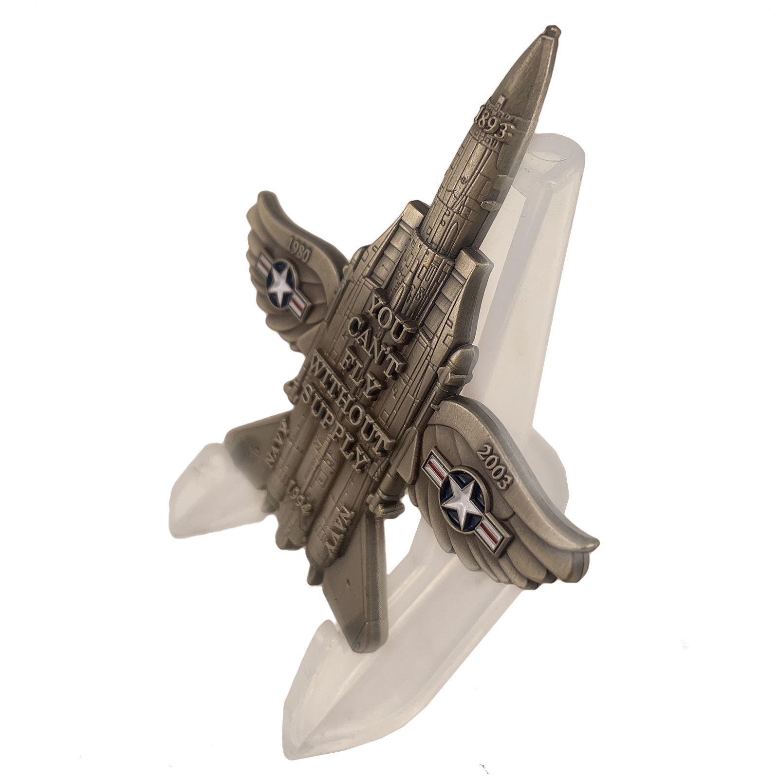 • Presented during Gil Logan’s retirement ceremony as the flagship tribute to his naval aviation career, with the aircraft shape immediately identifying his connection to naval air power.